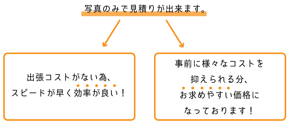 写真をいただいてから見積りが出来るので、その分スピードが上がり効率的に工事が出来るのと、費用を抑えて工事することを実現しております。